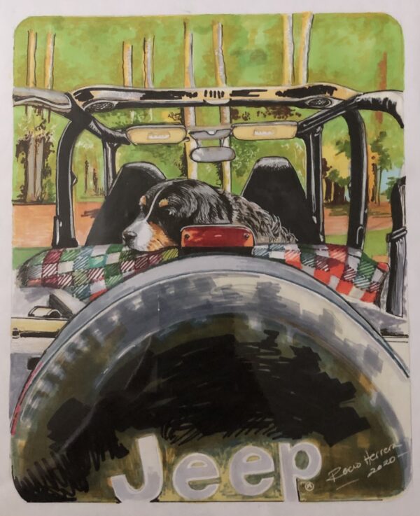 Original painting of a cozy dog in a Jeep with markers 9 x 11